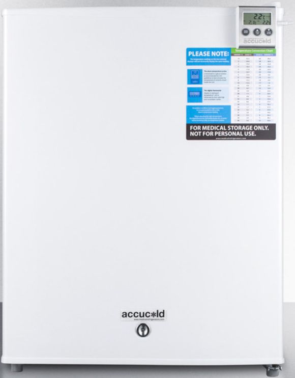 The Accucold® VAC Series refrigerators are specially designed to store sensitive medical and pharmaceutical materials under the proper conditions, with innovative construction for temperature stability and user-friendly features for added convenience. Sized for use on top of counters, the FF28LWHVAC is a compact all-refrigerator with automatic defrost operation. Fan-forced cooling helps to maintain even temperature distribution throughout the interior, ensuring the refrigerator stays within 2ºC of desired temperature and maximizing the usable storage space inside. The interior includes two drop-down covers that shield stored contents from being exposed to room temperature when the door is open. As recommended by the CDC for vaccine storage, this unit has a flat interior door liner. The FF28LWHVAC includes a factory installed front lock for added security. The self-closing door is an ideal feature for lab or medical settings, helping to protect valuable samples and vaccines when a busy staff may not always have time to ensure a tight seal. The hospital grade 'green dot' cord offers added safety in high-traffic locations. For temperature precision, the FF28LWHVAC includes a digital thermostat. A high/low temperature alarm sends an audible alert if the unit is out of set range, while also displaying a NIST calibrated temperature readout to the nearest tenth of a degree. An access port with a contact is pre-installed, allowing users to install additional monitoring equipment. Customers can specify the access port location upon order. In addition to the standard features of the VAC line, the FF28LWHVAC can be further customized to your exact specifications. Additional options include temperature loggers, open door alarms, and more. For more information, call our office to discuss your complete medical refrigeration needs with our sales team.