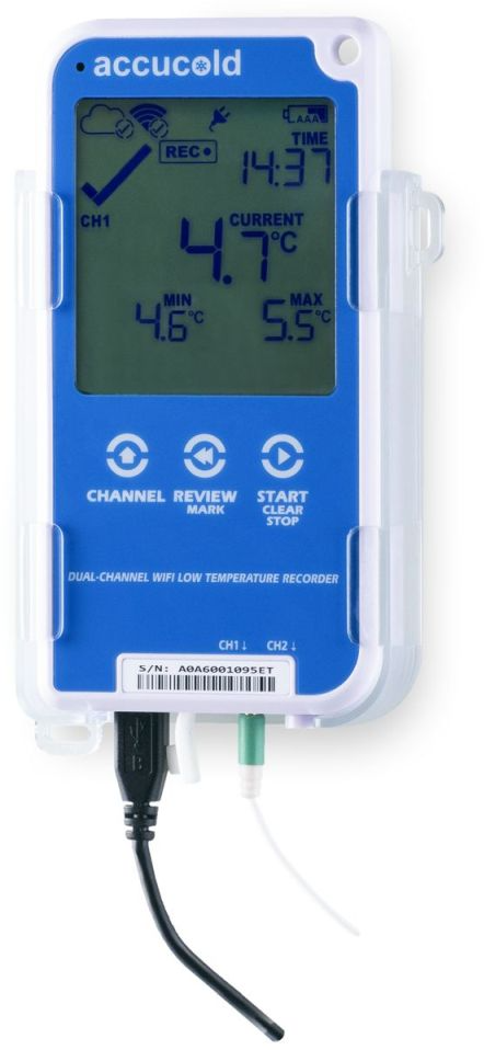 Accucold brings true convenience and trusted reliability to temperature logging with the DL11BWIFIKIT digital data logger (DDL). With a NIST calibrated probe and large display, this data logger offers all the features needed for accurate and convenient temperature monitoring in a cloud-based system compatible with WiFi or Bluetooth. The basic data plan allows you to set up 2 email addresses for temperature alerts. Through LogTag Online (LTO), you can upgrade the logger with a 12-month paid subscription that includes unlimited email addresses, SMS alerts, and WhatsApp notifications (note: maximum of 25/month for use outside the U.S.). The mobile app enables access of the paid account to record, store, and share logger data, as well as to receive alarm notifications and to view readings without a computer. Data is uploaded to the cloud in real time for immediate notifications. Reports can easily be downloaded to your device