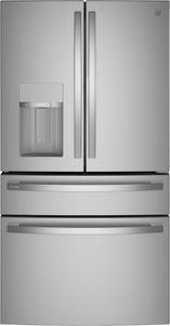 This GE Profile™ 4-french-door refrigerator with door in door features an adjustable temperature drawer with bin caddy, built-in Wi-Fi, LED light wall, soft-close drawers and hands-free autofill dispenser.Read More