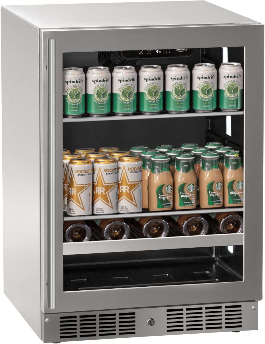 Experience premium beverage storage with our 24-Inch beverage center, designed to be used in both indoor & outdoor settings. Choose between a timeless stainless steel model or a panel-ready option for seamless customization. The interior is crafted in matte black with stainless steel accents, offering a modern aesthetic. Featuring 6-color multi-point LED lighting in adjustable white & cool tones. Equipped with adjustable glass shelving and wire wine racks, plus additional lower storage, this spacious 5.1 cu. ft capacity accommodates a combination of 9 wine bottles and 154 cans, or 15 wine bottles and 136 cans.Read More