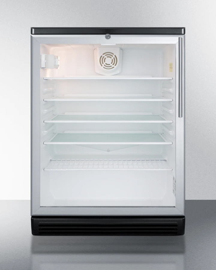 SUMMIT COMMERCIAL's SCR600BGLBI Series features 24" wide beverage refrigerators designed and manufactured in Europe for built-in undercounter installation in commercial settings. Sized with a convenient 24" footprint and generous 5.5 cu.ft. interior, the SCR600BGLBIHV features a front-breathing design for built-in installation under counters, with a fully finished black cabinet that also allows freestanding use.Read More