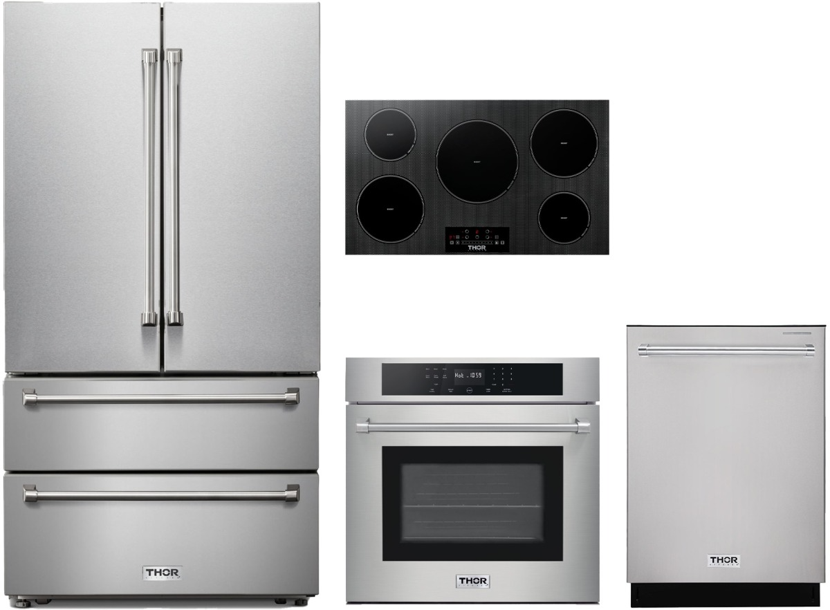 Thor Kitchen® 4 Piece Stainless Steel Kitchen Package with a French door refrigerator, single electric wall oven, built in dishwasher and induction cooktop.Read More