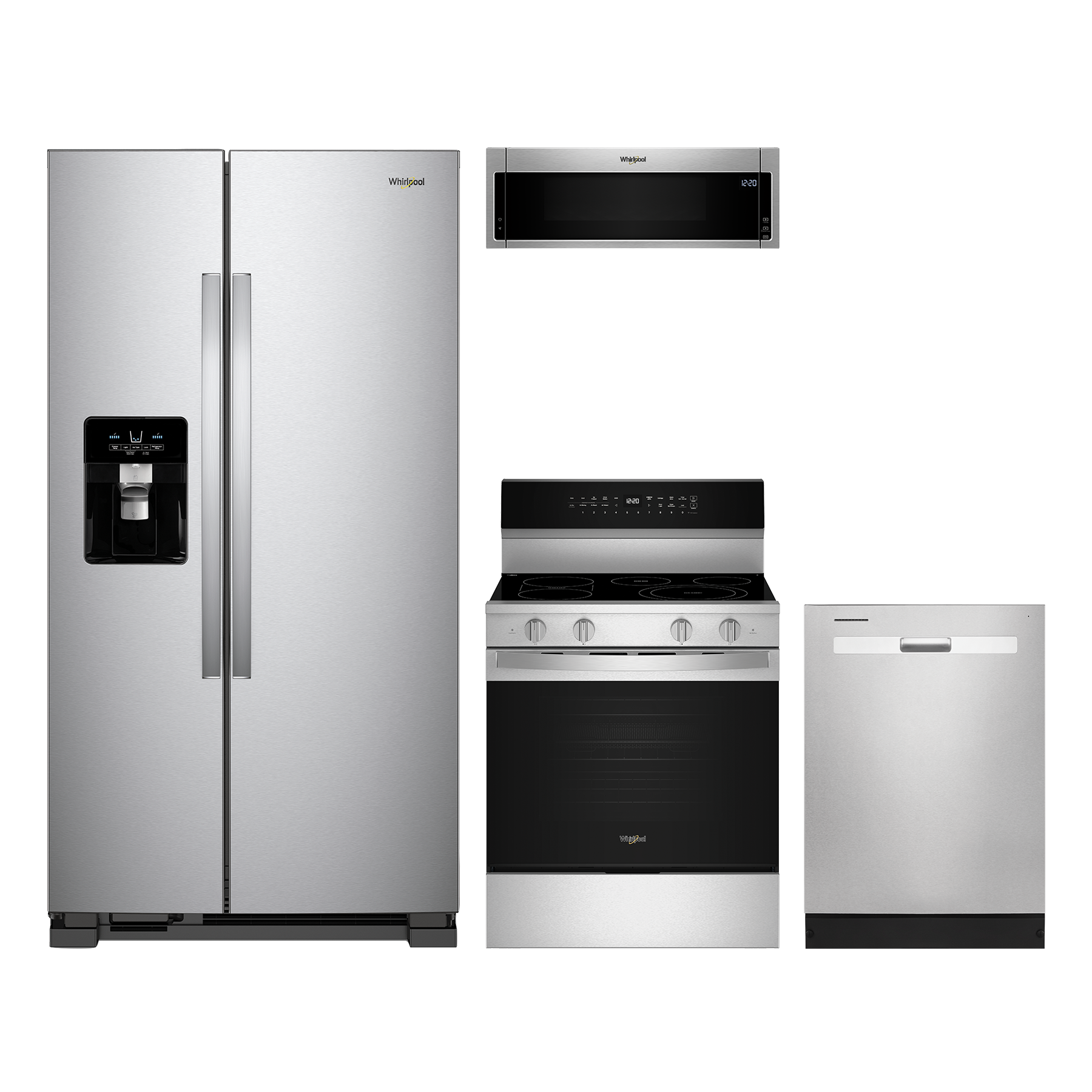 Whirlpool - 4-piece kitchen package including Side by Side Refrigerator, Over the Range Microwave, Built-In Dishwasher & Freestanding Electric RangeRead More